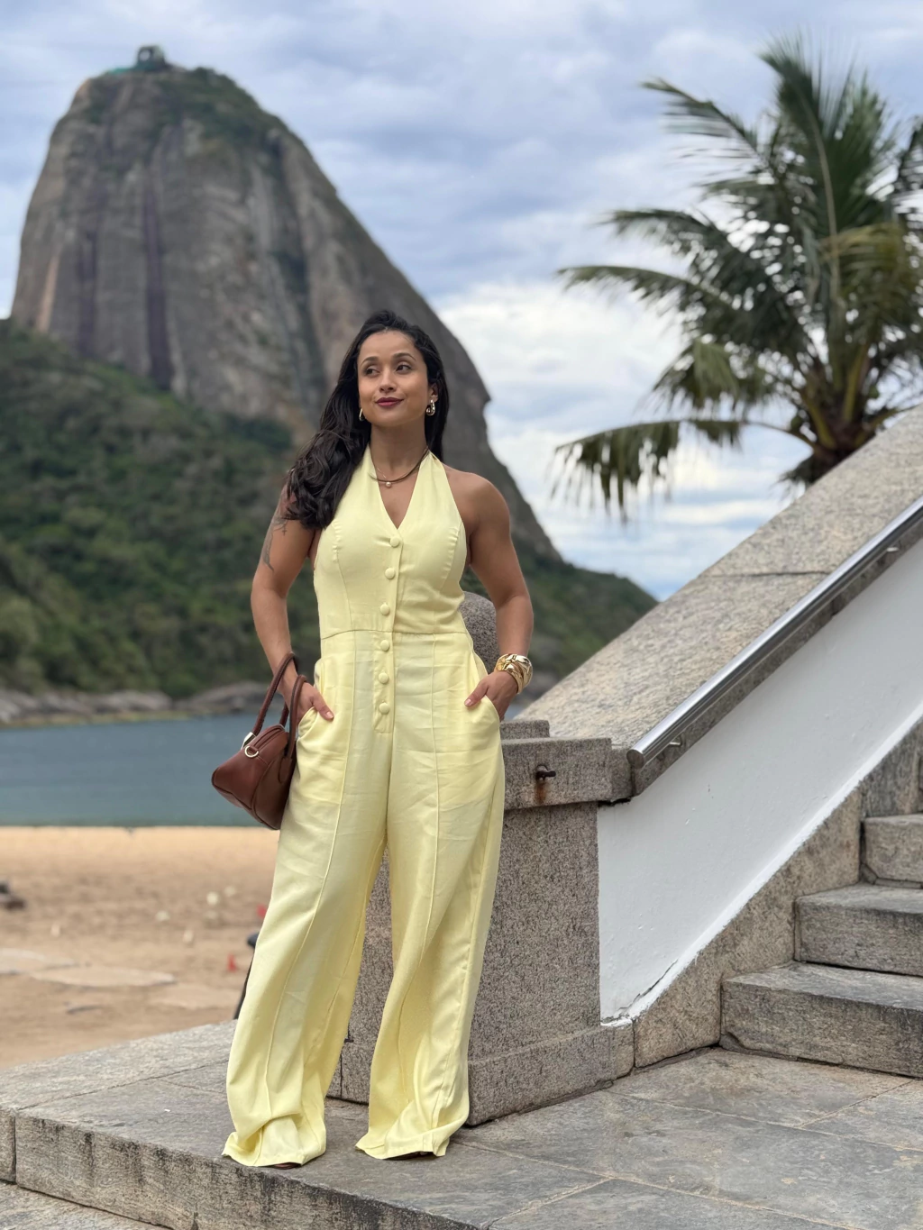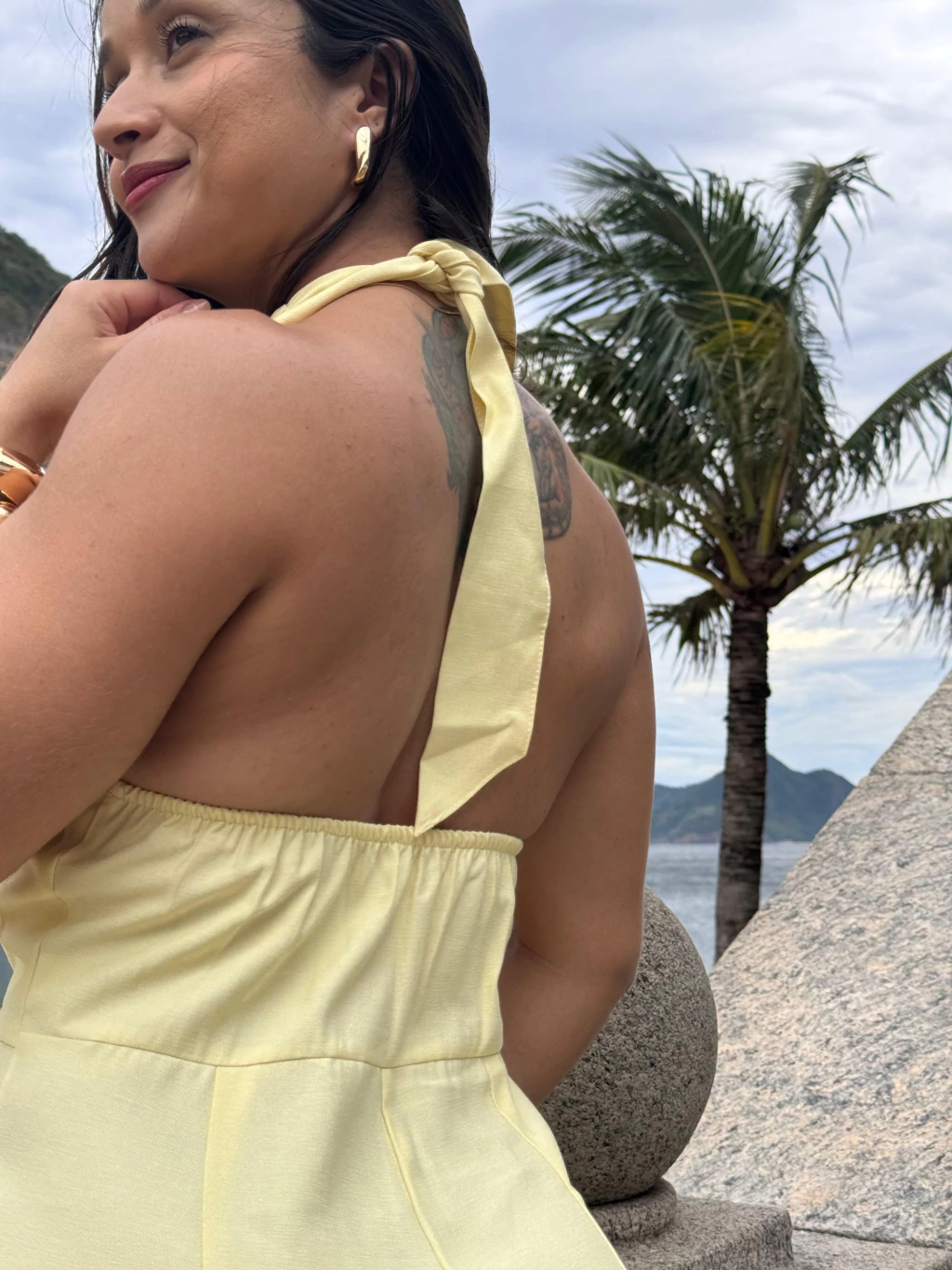 Macacão modelo pantalona, possui amarração frente única no pescoço, todos botões frontais funcionais, possui bolsos faca e elástico nas costas